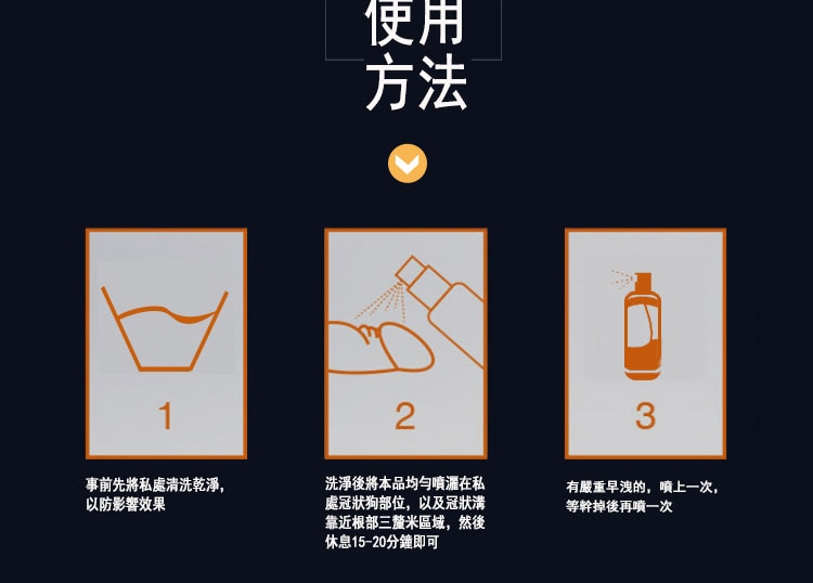 【使用方法】:事前先將私處清洗幹凈,以防影響效果;洗凈後將本品均勻噴灑在私處冠狀溝部位並用手塗抹均勻,然後休息15-20分鐘即可;有嚴重早泄者的,噴上壹次,等幹掉後再噴壹次。