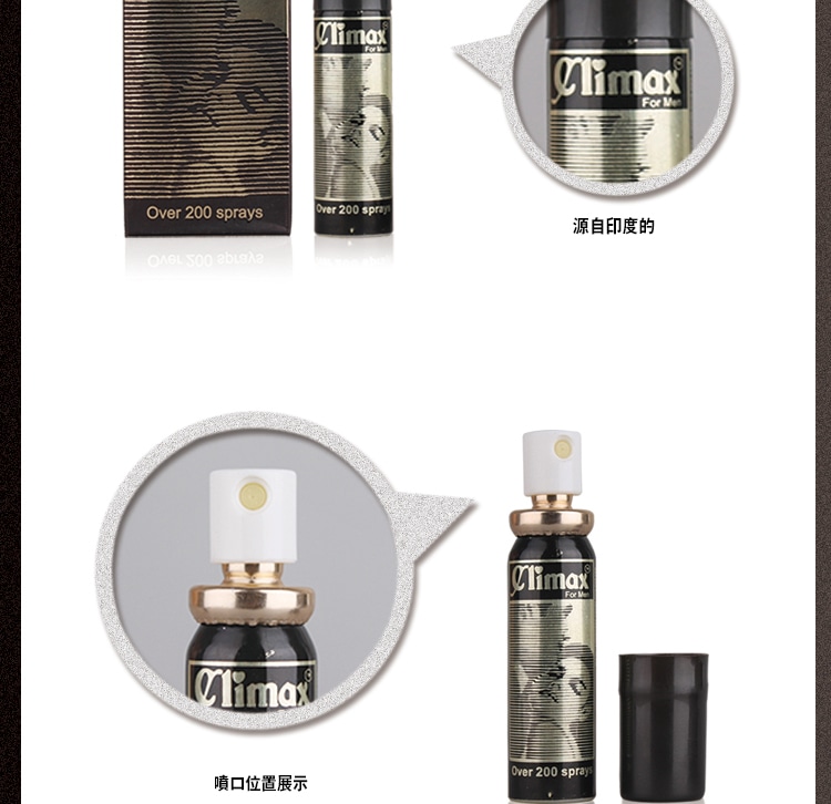 Climax延時噴劑 Spray創始於1986年,是一款專門為男士設計的延時噴劑,從廣告語“A world quality for real men”中可見壹斑。其母公司是印度的醫藥生產商Midas-Care生物醫藥公司,產品涵蓋註射劑、口服液、糖漿劑、片劑、膠囊劑、顆粒劑和噴劑等7個劑型,旗下擁有Fast Aid Kit,Reli Spray,Coolex, Climax Spray,Spraymintt,Vinodine等多個知名品牌、享有極高的消費者信任度和美譽度。Climax伴隨著Midas-care的創立而誕生,是其最引以為傲的產品之壹,其配方經過不斷發展和完善,現如今對房事質量的提升效果已經非常顯著。