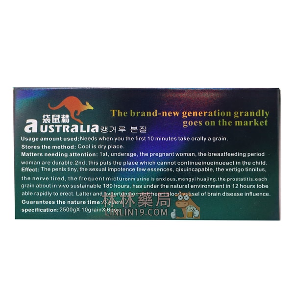 以西澳紅袋鼠的睪丸爲原料,採用最新的超低溫生化提煉工藝精製而成。根據近年中西醫結合的研究,腎虛實際上就是缺乏腎上腺皮質激素。而腎虛又是人體所有疾病的根源。生化袋鼠精能補腎益氣,活血固本,有效提高腎上腺皮質激素的分泌水平,促進雄性激動素的分泌,增加精子的數量並提高精子的活力。對男性陽萎早泄有顯著的療效。能有效增加人體的耐力,對運動後體力恢復有明顯的幫助。能有效改善腰膝酸痛,頭暈耳鳴的狀況。對體弱及老年病後恢復亦有顯著的功效。
