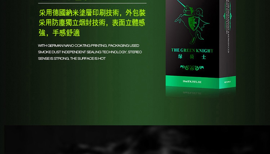 法國綠騎士持久液,針對男性早洩問題而開發的持久產品,性愛時間太短,力不從心草草了事的解決了 讓愛人達不到高潮,綠騎士專為男性設計研發,精選植物精華,吸收快,效果強勁,噴一噴激發性欲,給她愛的時間久一些 也多一些享受,重振男人雄風。